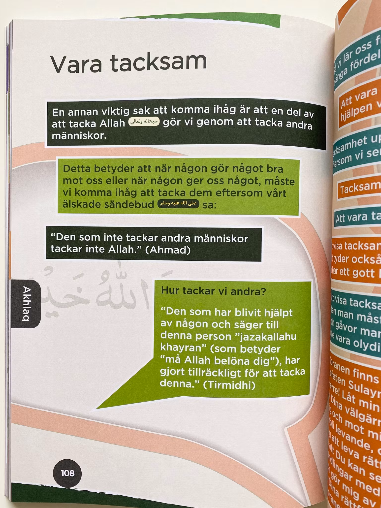 Andra boken i serien Islamiska studier. Huvudteman i denna bok innehåller; lärande i wudu’ och ghusl, ahadith om vänlighet mot grannar, första uppenbarelsen. Berättelser om Hud (as) och Salih (as), de uppenbarade böckerna, betydelsen av att hålla löften, vänlighet mot djur och etikett i att hälsa på varandra.